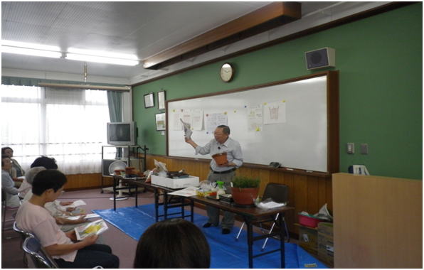 「園芸教室」が開催されました。 今年で17回目の開催となりますが参加者49名と多目的ホールが満員となる盛況ぶりでした。開催の前に北尾会長より高齢者の事故防止の話がありました。これは先日、下京署で開催された交通事故防止対策会議で各地区の社会福祉協議会でも積極的に高齢者の方にPR活動をしてほしいとの要請に基づくものです。近年、65歳以上の高齢者が被害者、加害者になる交通事故の割合が共に約50%に及んでいるので特に気を付けて欲しいとの話でした。 つぎに、本日の講師が紹介されました。毎年、園芸教室の講師をお願いしているフラワー・グリーンアドバイザーの鈴木茂氏はタキイ種苗で40数年にわたり小売部門を担当され、主に野菜、花、木を販売されていた大ベテランです。 本日のテーマは「白蝶草」の栽培方法がメインです。なるべく大きめの尺鉢(約30センチ)の深めのものを用意し、用土は水はけのよい市販の培養土を使い、毎日ていねいに水やりをしていれば、安心して栽培できるとのことでした。 その他、鉢植えは土の選び方がポイントになるので有名メーカーの高いものを買ったほうがいい。又、花の種類や植栽日等を鉛筆で書いたラベルを横に立てておくと間違わなくて済む等、実演を交えた話に参加者は熱心に講義を聞いておられました。 最後に質疑応答の時間を用意しましたが次から次の質問で予定の時間をオーバーしてしまいました。帰りには本日のテーマの花「白蝶草」の鉢植とタキイ種苗発行の「花と野菜のガイド」をお持ち帰りいただき、皆さんに喜んでいただきました。 写真はその時の様子です