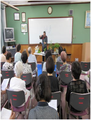 当日は65歳以上の高齢者37人が参加して会場がほぼ満席になる盛況ぶりでした。 北尾会長の開会挨拶に続いて本日の講師の紹介がありました。 毎年、園芸教室の講師をお願いしているフラワー・グリーンアドバイザーの鈴木茂氏です。鈴木氏はタキイ種苗で40数年にわたり小売部門を担当され、主に野菜、花、木を販売されていた大ベテランです。 本日のテーマは「ばれんぎく」(エキナセア)の育て方です。 ・置き場所、植え場所は半日以上日光が当たる所で育てる。 ・地植えの場合は水はけのよいところに植え、土質は特に選ばない。 赤玉土(小粒)7・腐葉土3の割合の用土に植え込む。 鉢植えの場合は6号鉢(18cm)以上の鉢を使う。 ・水やりは地植えの場合、乾燥のひどいとき以外は必要ない。 鉢植えの場合は土の表面が乾いたらたっぷりと与える。 ・肥料は年に1回3〜4月ごろに粒状肥料を与える程度にする。 等の講義内容でした。 最後に質疑応答があり活発に質問が出ていました。 本日、ご参加頂いた皆さんには本日のテーマ花「バレンギク」の鉢植えとタキイ種苗発行の「花と野菜のガイドブック」お持ち帰り頂き喜んで頂きました。 写真はその時の様子です。