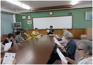 平成26年6月14日(土)午前10時〜午後2時まで「健康すこやか学級」を開きました。当日は参加者が9名と少なかった為、皆さんの顔が見えるようにテーブルをセットしました。開会までにいつものように血圧、脈を測定しました。北尾会長の開会挨拶の後、すこやか体操をしました。今回の勉強は高齢サポート・島原(島原地域包括支援センター)の後藤さんに来て頂き悪徳商法、詐欺の被害にあわない為の予防方法をご自身の体験事例を交えてお話していただきました。・不審な手紙、はがき、電話があったら一人で抱えないで同居の家族、近所の人に相談する。・電話を留守電にセットしておき、おかしな電話や相手が解らない場合は電話に出ない。・儲け話の電話があったらきっぱり「いりません」と相手にしないで電話を切る。等の内容でした。 本日のいきいきタイムは卓球バレーです。ゲームが白熱してくるとラケットを持つ手も力が入っていました。 昼食を挟んで昼からはカラオケタイムです。童謡から懐メロまで全11曲を合唱したり、独唱したりして皆さん楽しんでおられました。写真はその時の様子です。