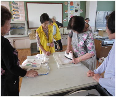無地の布製の手提げ袋に花、動物、自分の名前などを特殊なクレヨンで絵付けをしてそれをアイロンがけしたら出来上がりです。上手に出来上がったオリジナルのバックを皆さん喜んでお持ち帰りいただきました。